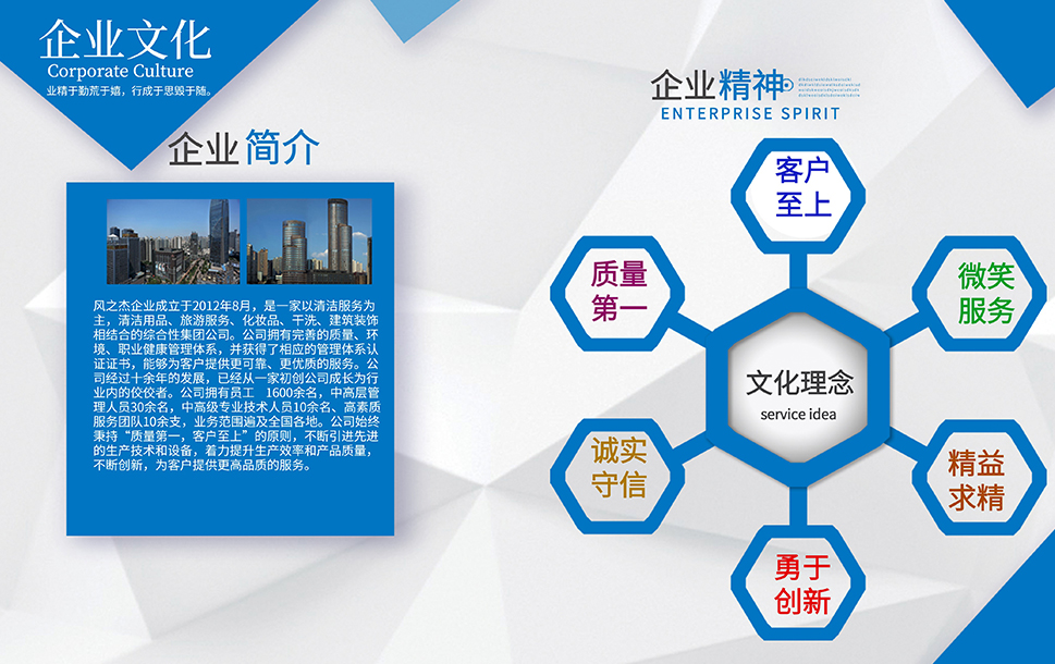 公司是一家以清潔服務為主,旅游,干洗、化妝品、裝修和餐飲相結合的多元化發(fā)展運營的服務性企業。企業本著誠信第一、服務至上的原則,依靠公司盡我所能、力我所及的信條從2012年到現在服務了多家企業,現在我們已經擁有了400家左右的清潔服務項目和多家洗衣店。我們會一直牢記服務,創新才是我們企業發(fā)展的服務宗旨。